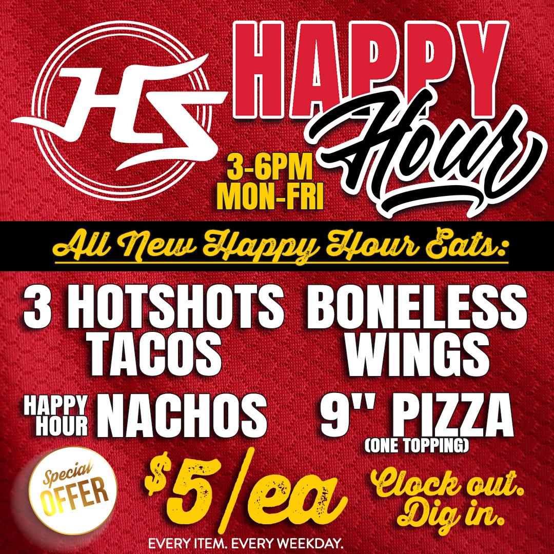 Join us for the full Hotshots Happy Hour experience, featuring unbeatable drink specials, $5 eats, and a few extras that make after work even better.